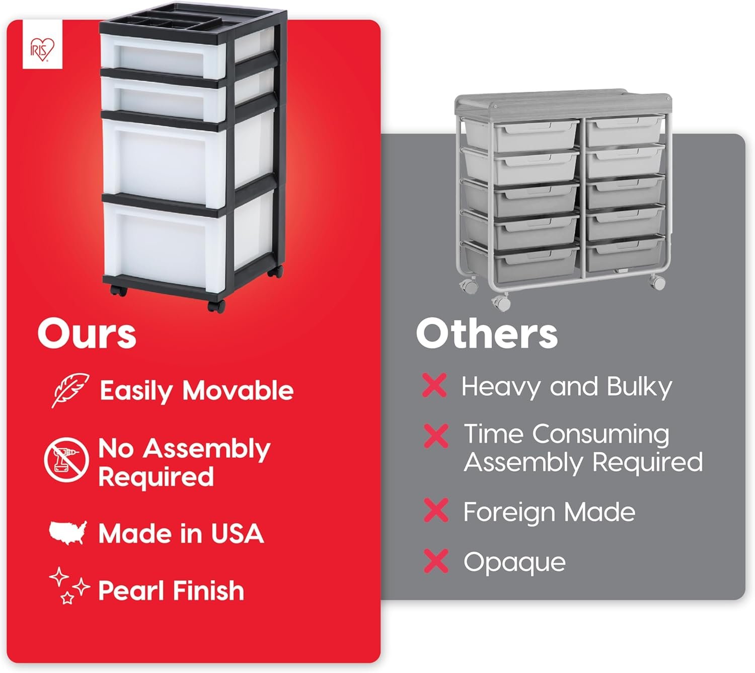 The IRIS USA Plastic Drawer Storage Organizer Rolling Cart offers a versatile storage solution for any room, from office to laundry. With four smooth-gliding drawers and removable wheels for easy mobility, this organizer keeps your essentials tidy and accessible. Made in the USA with high-quality, durable plastic, its sturdy design and drawer stops ensure both convenience and safety. Ideal for classrooms, closets, and craft rooms, this compact cart from IRIS USA is a must-have for streamlined organization.