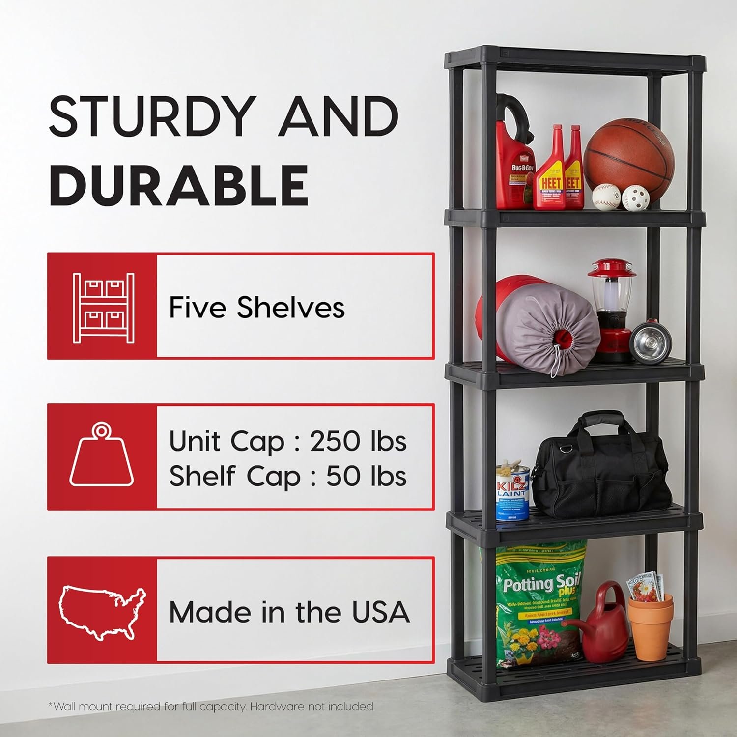 - Resin construction: Built from recycled and rust-resistant plastic, it’s easy to clean compared to steel garage shelving.