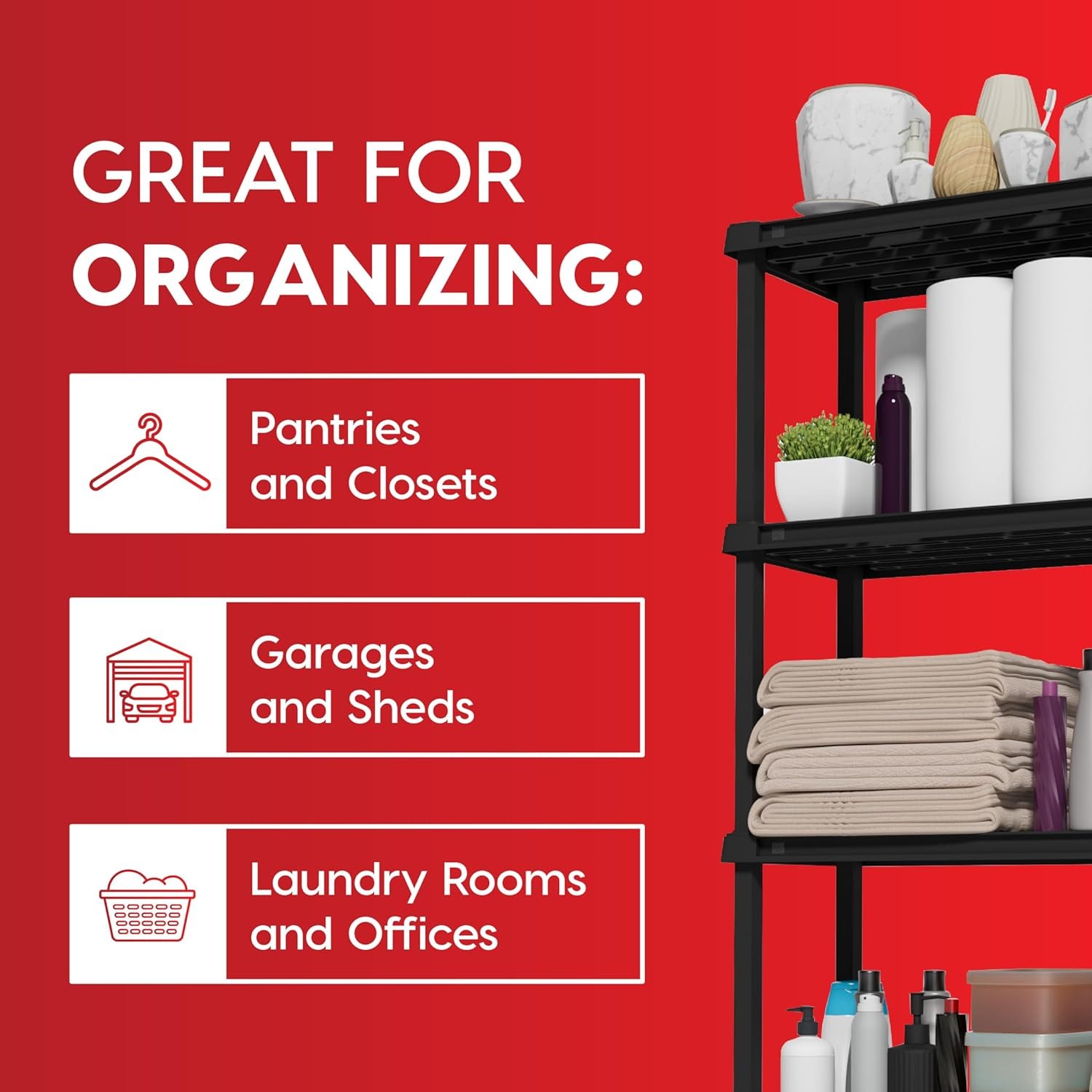 The plastic shelves can support up to 50 lbs per shelf (250 lbs total). For heavier needs, seek utility racks made for heavier loads. - Can it be used in the garage or laundry room?